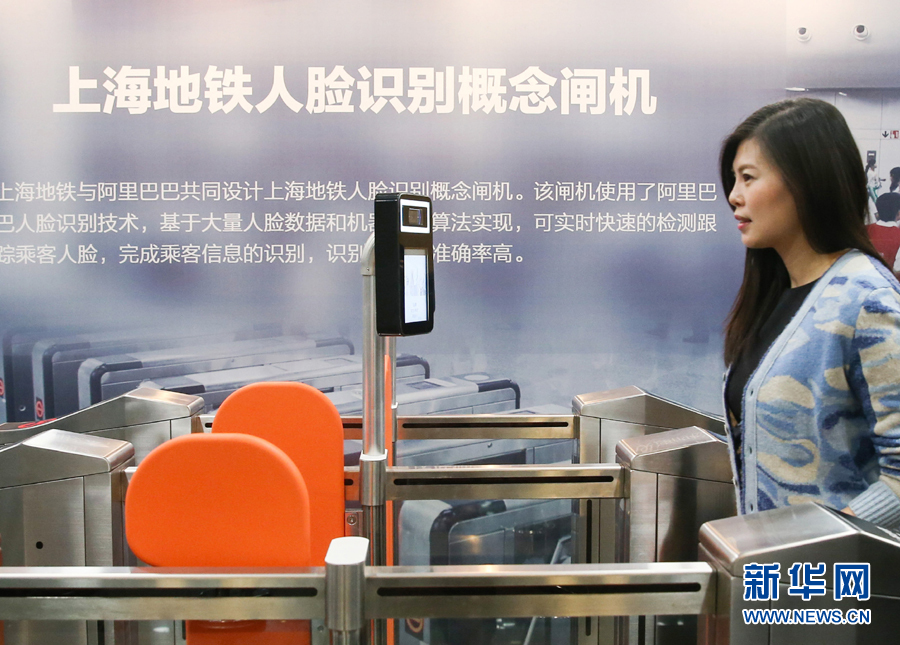 在上海申通地铁集团有限公司,工作人员在现场体验刷脸进站技术(2017年12月5日摄)。新华社记者丁汀摄