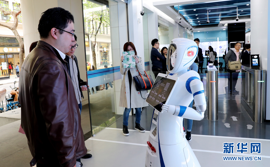 一位市民在位于上海九江路的无人银行入口处向迎宾机器人说明需要办理的业务种类(4月12日摄)。近日,中国建设银行在上海九江路开出国内首家无人银行。新华社记者方喆摄