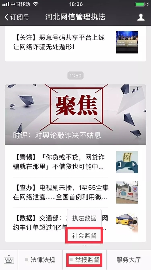 关注“河北网信管理执法”微信公众号,点击菜单栏“举报监督”——“社会监督”即可。
