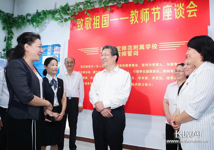 9月9日下午,省委书记、省人大常委会主任王东峰在保定市看望慰问教师,代表省委、省政府向大家及全省教师表示亲切慰问,致以崇高敬意。这是王东峰到保定师范附属学校与老师们亲切交流。长城新媒体记者庞晓玮摄
