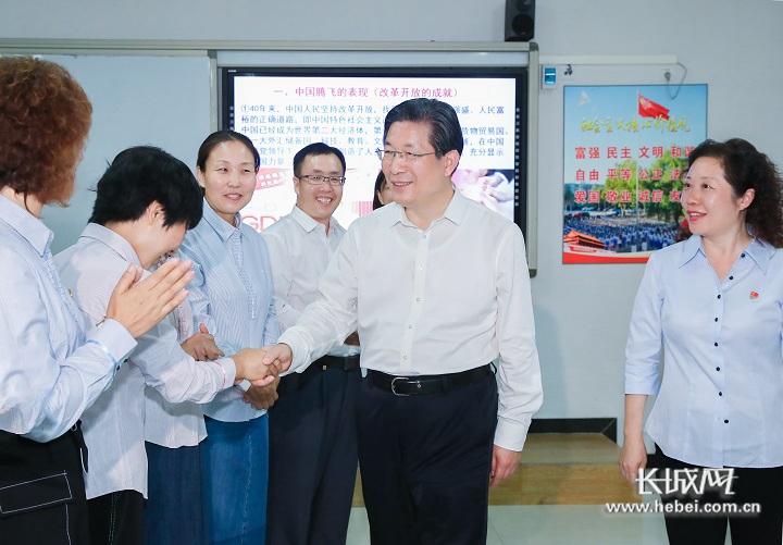 保定市第十七中学原名直隶女学堂,是一所创建于1906年的百年名校。王东峰参观了该校春霖书院、团队活动室、创客实验室、人工智能实验室、学科研究中心等,与师生们互动交流。王东峰指出,保定市第十七中学历史悠久、底蕴深厚,长期以来培养了很多人才。在新时代,全校教育工作者要在继承学校光荣传统的基础上,锐意改革、开拓创新,切实办好人民满意的教育,为全省教育事业探索新经验,再创百年老校新辉煌。