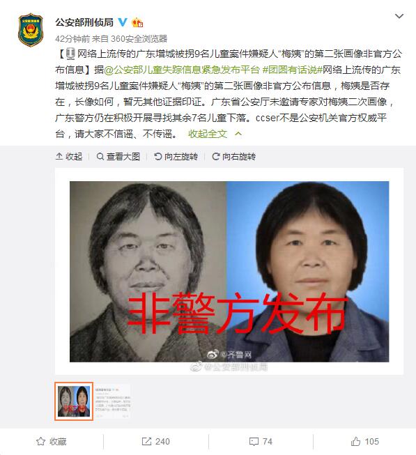 据公安部刑事侦查局官方微博援引公安部儿童失踪信息紧急发布平台官方微博消息,目前,网络上流传的广东增城被拐9名儿童案件嫌疑人“梅姨”的第二张画像非官方公布信息,梅姨是否存在,长像如何,暂无其他证据印证。