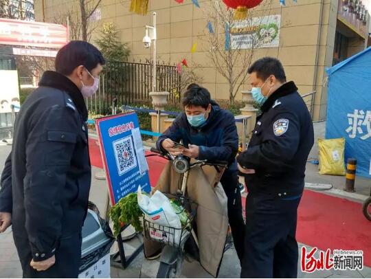3月15日,邢台市公安局桥西分局胡家营派出所民警在水印城小区门口引导居民扫码登记信息。