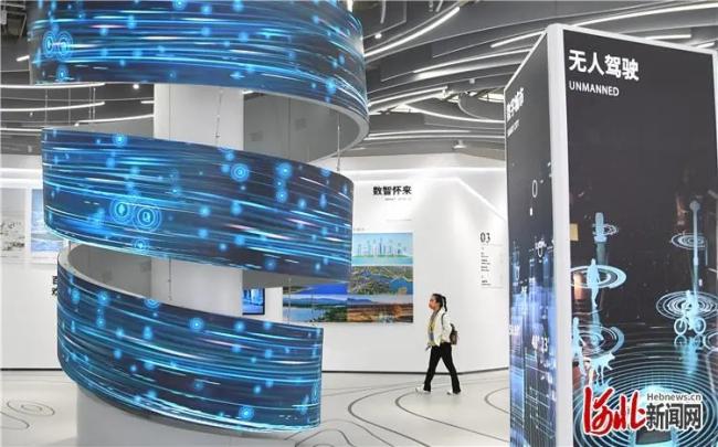 9月6日,游客行走在数博会怀来分会场数字会展中心内的旋转曲面屏旁。
