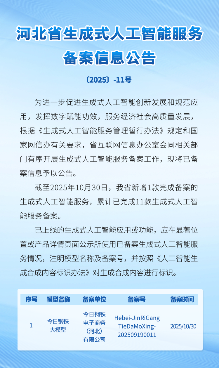 河北省生成式人工智能服务备案信息公告