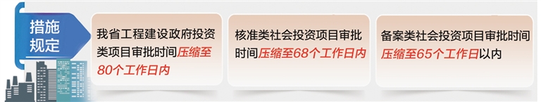 其中,立项用地规划许可阶段政府投资类项目审批时限压缩至25个工作日内;核准类社会投资项目审批时限压缩至13个工作日内;备案类社会投资项目审批时限压缩至10个工作日内。工程建设许可阶段审批时限压缩至15个工作日内。施工许可阶段审批时限压缩至25个工作日内。竣工验收阶段审批时限压缩至15个工作日内。