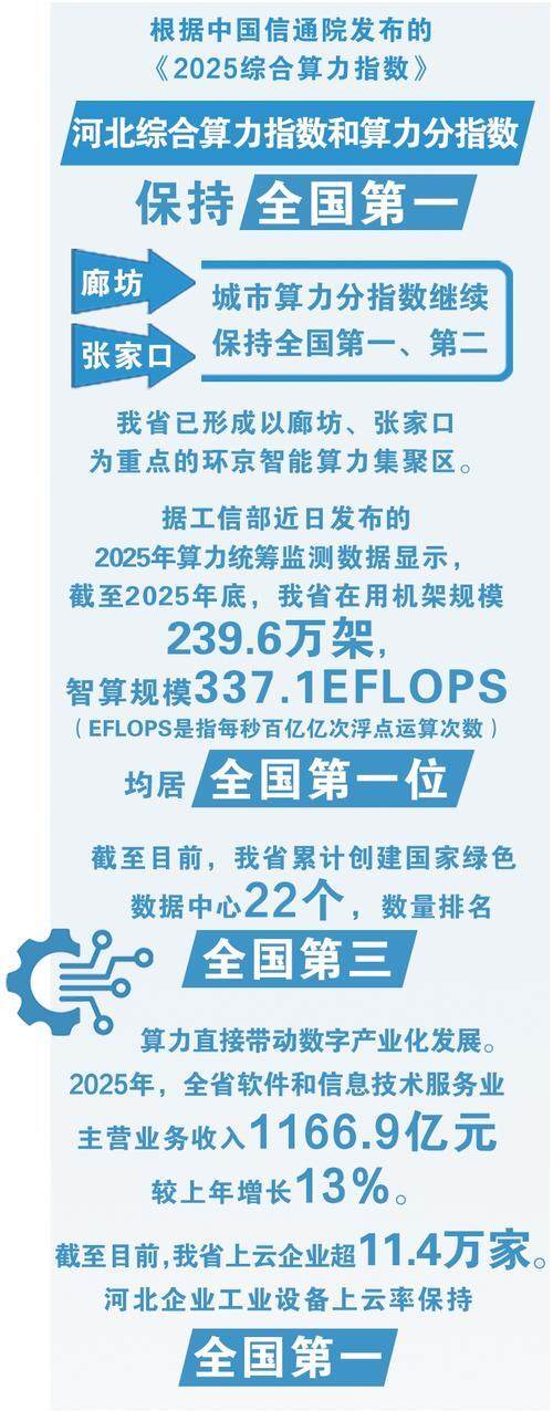根据中国信通院发布的《2025综合算力指数》,我省综合算力指数和算力分指数继续保持全国第一,廊坊、张家口城市算力分指数继续保持全国第一、第二。