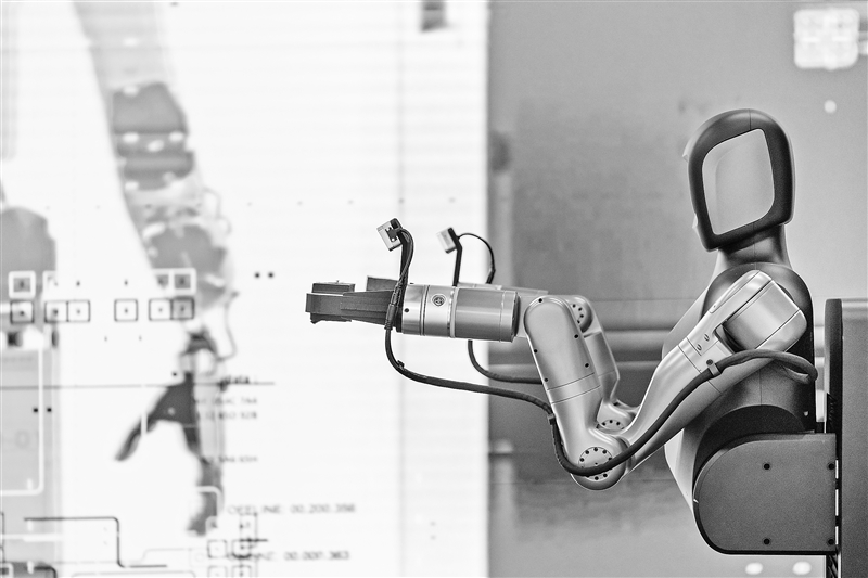 图为工业人形机器人在演示货物搬运作业后回到工位