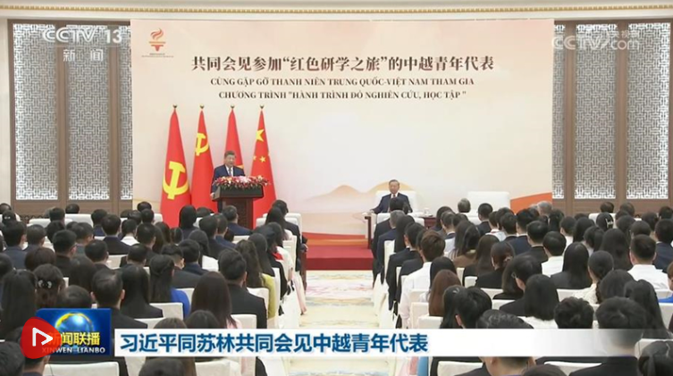 习近平发表讲话,表示去年我和苏林总书记一道启动“红色研学之旅”项目,一年来,两国青年共同探寻中越友好的红色基因,感受中国式现代化的万千气象,在中国各地留下许多互学互鉴、相知相亲的生动故事。不久前,我收到越南河内国家大学外语附中等学校的同学们用中文写来的信,分享了参加“红色研学之旅”的深刻感悟,立志做中越友谊的传承者和传播者,我感到很欣慰。